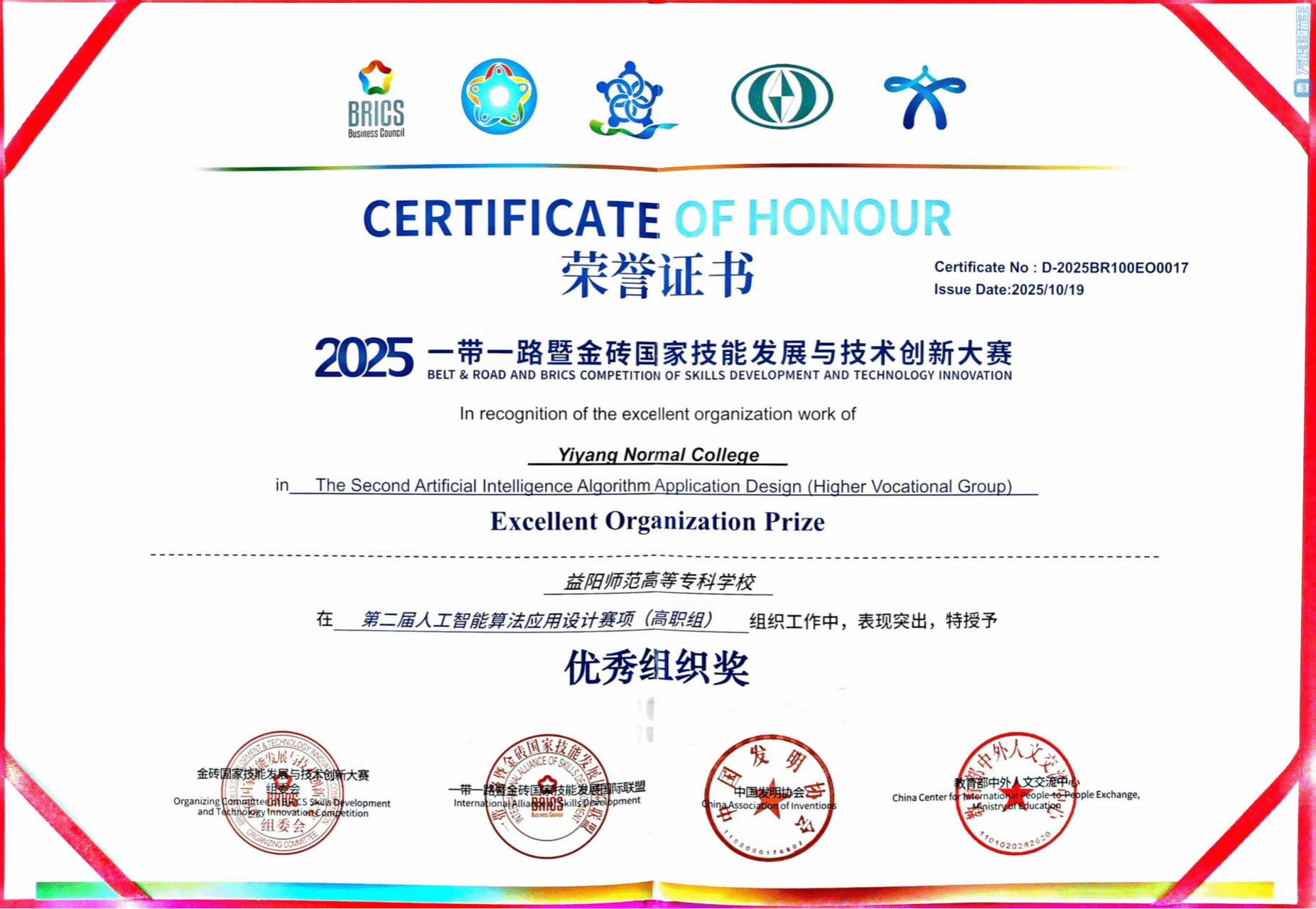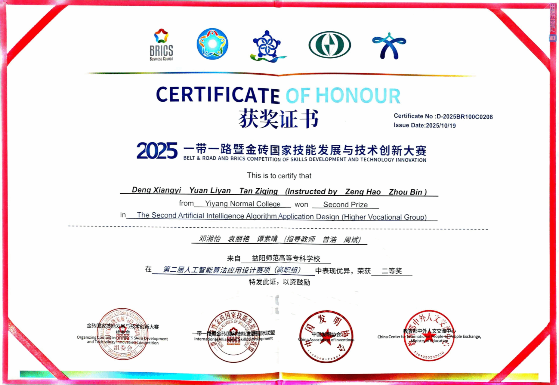 2025年10月30日,2025一带一路暨金砖国家技能发展与技术创新大赛之“人工智能算法设计”赛项全国总决赛以线上形式成功举办。我校智能科学与智慧教育技术学院曾浩、周斌老师指导,邓湘怡、袁丽艳、谭紫晴等同学组成的参赛团队,在“车牌识别与智能道闸系统集成”项目中,凭借扎实的算法优化能力与鸿蒙平台开发技术,于学校实验室完成全系统设计与实现,最终从全国226所高校中脱颖而出,荣获全国总决赛二等奖。学校同时获评“优秀组织奖”。